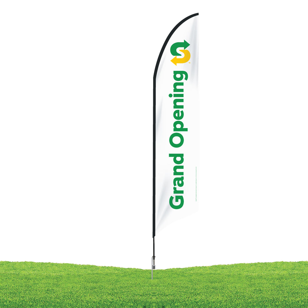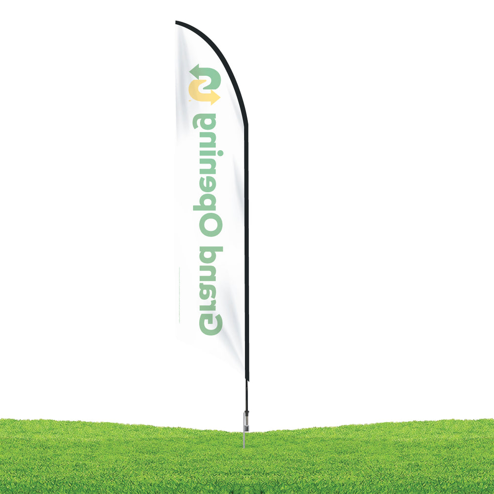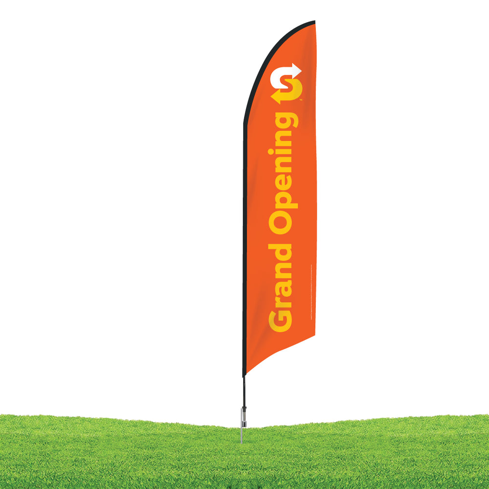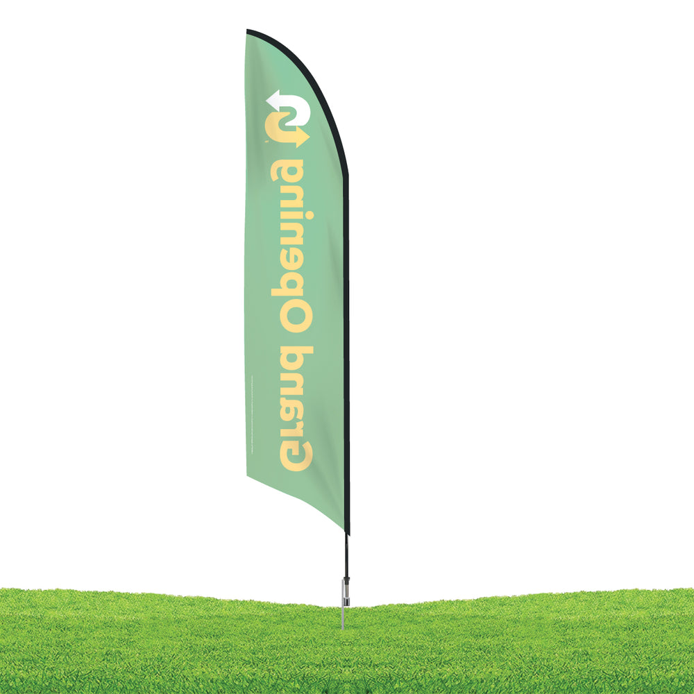 The Feather Flag is suitable for indoor and outdoor events. Effectively advertise with our large feather flag. Black flag trim is sewn on the edge of the graphic (pole-side), leaving a pocket for the pole insertion. Total height of the flag is 14' including ground stake.